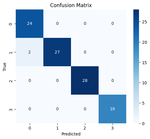 cm = confusion_matrix(y_test, y_pred)plt.figure(figsize=(6, 5))sns.heatmap(cm, annot=True, fmt="d", cmap="Blues")plt.xlabel("Predicted")plt.ylabel("True")plt.title("Confusion Matrix")plt.show()