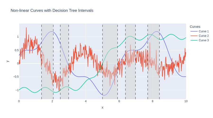 For each interval, summary statistics (mean, standard deviation, slope) are computed and used as features for the decision tree.